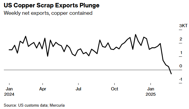 此外,关税威胁已导致美国废铜出口枯竭,这一点也至关重要——全球铜产量的约三分之一来自废铜,废铜的流动往往起到市场缓冲的作用,在价格高时上升,在价格低时下降。