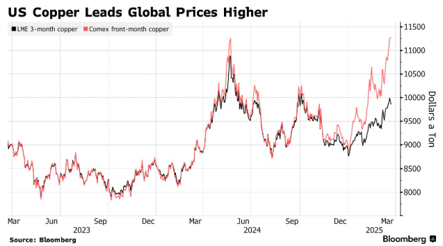 而关税威胁和短时间内的大量需求,也正导致美国铜价显著高于了其他海外市场。上周,纽约商品交易所(Comex)的铜期货价格一度比全球其他地区每吨高出了1400美元以上,这为交易商将每一吨可用铜运往美国创造了“巨大动力”。
