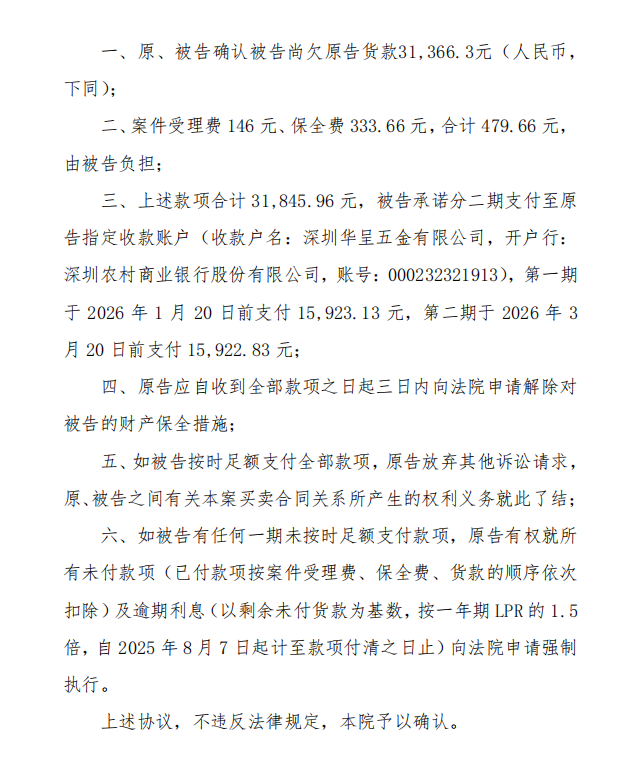 截至2026年2月4日,我司仍未收到调解约定的成大公司应付货款第一部分,并且无法正常联系沟通,目前我司已委托律师向法院申请强制执行。